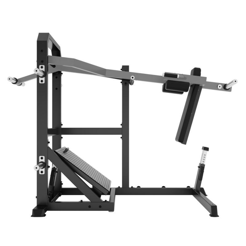 Тренажер обеспечивает глубокую и контролируемую траекторию приседа, позволяя эффективно прорабатывать квадрицепсы, ягодичные мышцы и заднюю поверхность бедра. Регулируемая по углу платформа помогает подобрать оптимальное положение стоп, а высокая спинка и подушки под плечи надёжно фиксируют корпус на протяжении движения. Стартовый фиксатор и демпферы делают тренировку безопасной, плавной и комфортной как для опытных спортсменов, так и для пользователей с разным уровнем подготовки.