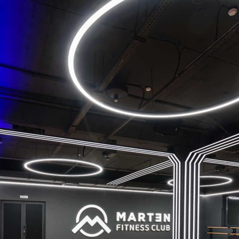 Эффектное световое кольцо диаметром 2,5 метра заполняет мягким равномерным светом пространства с высокими потолками – зоны свободных весов или групповых программ, зоны для грузоблочных или нагружаемых тренажеров, кардиооборудования. Нейтральный свет 4000 K корректно передаёт цвета оборудования и интерьера, подходит для фото- и видеосъёмки. Дополнительное преимущество – светильник состоит из четырёх модулей без торцевых заглушек, легко собирается в единый круг или компонуется в разнообразные фигуры, сочетается с линейными модулями, кольцами меньшего диаметра и полукольцами, тем самым позволяет выделять тренировочные зоны или создавать декоративные инсталляции.