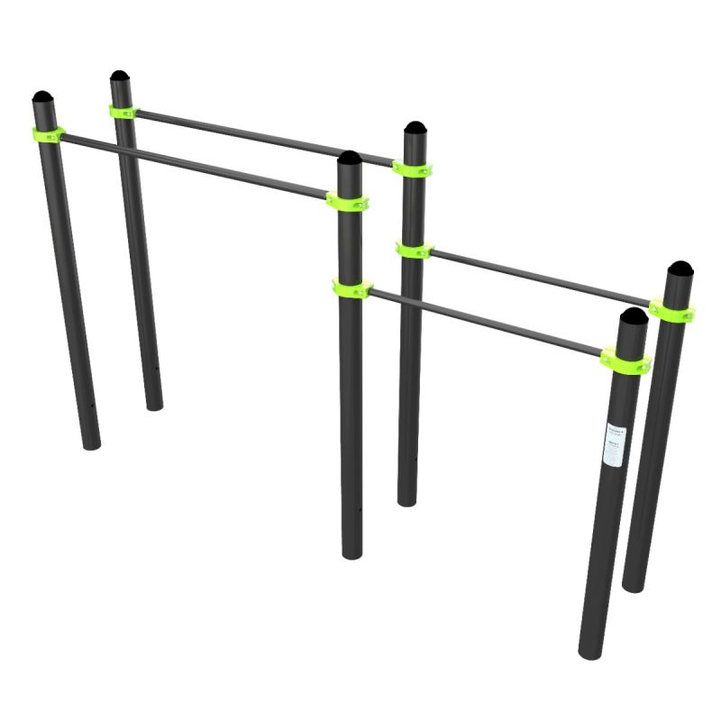 Снаряд с параллельными брусьями на разной высоте позволяет варьировать угол нагрузки и подбирать упражнения под уровень подготовки. Отличный вариант для тренировок с постепенным усложнением, а также для занятий подростков и взрослых на одной площадке.